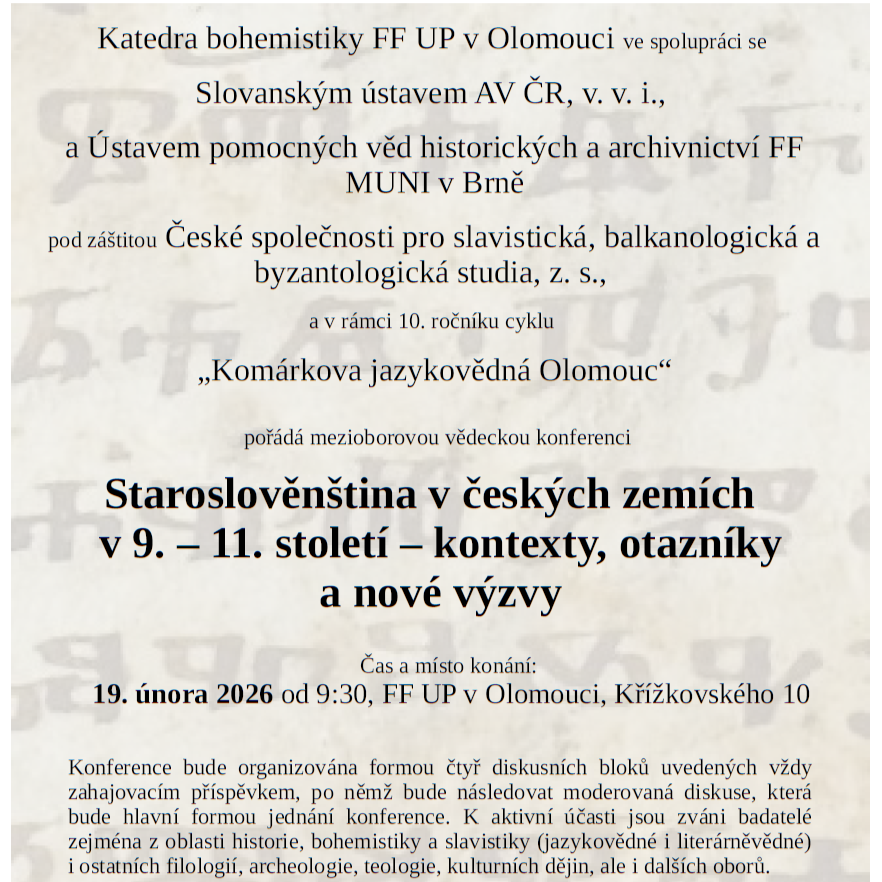 Katedra bohemistiky FF UP v Olomouci ve spolupráci se Slovanským ústavem AV ČR, v. v. i., a Ústavem pomocných věd historických a archivnictví FF MU v Brně pořádá mezioborovou vědeckou konferenci Staroslověnština v českých zemích[…]